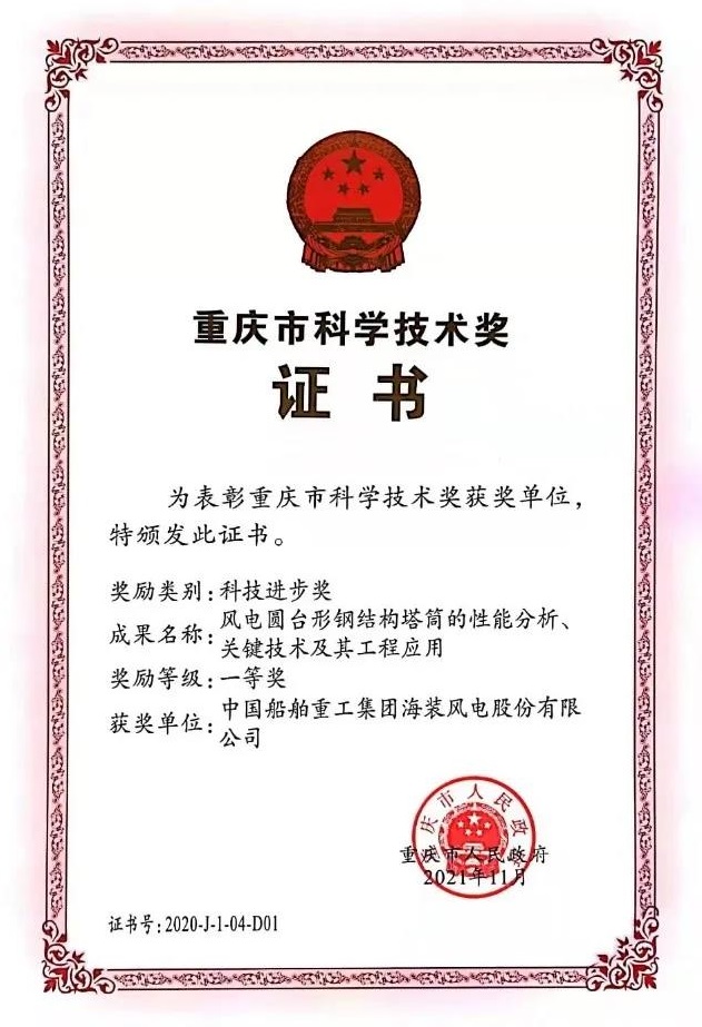 中國船舶集團旗下中國海裝申報的兩項成果《高效安全大型風(fēng)電機組傳動鏈關(guān)鍵技術(shù)與應(yīng)用》《風(fēng)電圓臺形鋼結(jié)構(gòu)塔筒的性能分析、關(guān)鍵技術(shù)及其工程應(yīng)用》榮獲重慶市科技進步獎一等獎。