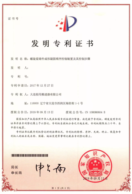????近日,大連船推申請的《螺旋槳鑄件成形凝固順序控制裝置及其控制步驟》發(fā)明專利通過國家知識產(chǎn)權(quán)局審查,獲得國家發(fā)明專利授權(quán)。