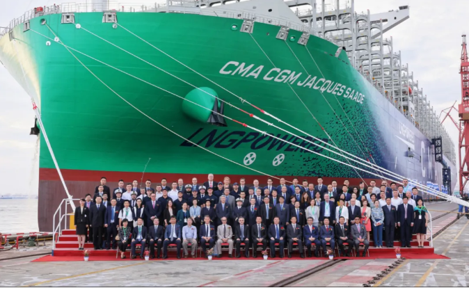 9月22日,由中國船舶集團(tuán)有限公司旗下滬東中華造船(集團(tuán))有限公司和中國船舶工業(yè)貿(mào)易有限公司作為聯(lián)合賣方為世界著名航運(yùn)公司——法國達(dá)飛海運(yùn)集團(tuán)建造的全球首艘23000TEU雙燃料動(dòng)力集裝箱船“達(dá)飛雅克?薩德”號,在上海長興島造船基地命名交付。中國船舶集團(tuán)副總經(jīng)理孫偉、達(dá)飛海運(yùn)集團(tuán)董事會(huì)主席魯?shù)婪颉に_德出席儀式并致辭,教母譚雅·薩德為新船命名,法國駐滬總領(lǐng)事紀(jì)博偉應(yīng)邀出席儀式。
