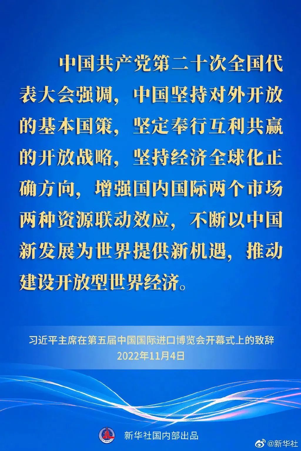習近平指出,中國共產黨第二十次全國代表大會強調,中國堅持對外開放的基本國策,堅定奉行互利共贏的開放戰(zhàn)略,堅持經濟全球化正確方向,增強國內國際兩個市場兩種資源聯(lián)動效應,不斷以中國新發(fā)展為世界提供新機遇,推動建設開放型世界經濟。