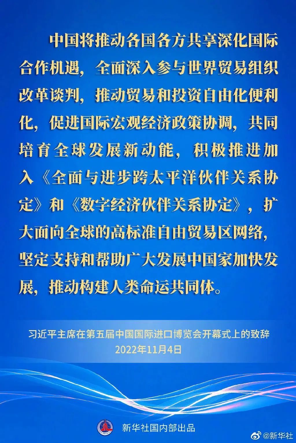 ——中國將推動各國各方共享深化國際合作機遇,全面深入參與世界貿易組織改革談判,推動貿易和投資自由化便利化,促進國際宏觀經濟政策協(xié)調,共同培育全球發(fā)展新動能,積極推進加入《全面與進步跨太平洋伙伴關系協(xié)定》和《數字經濟伙伴關系協(xié)定》,擴大面向全球的高標準自由貿易區(qū)網絡,堅定支持和幫助廣大發(fā)展中國家加快發(fā)展,推動構建人類命運共同體。
