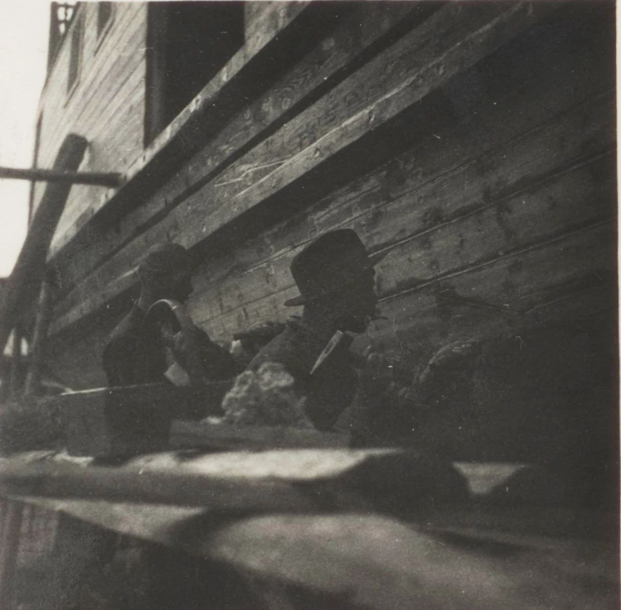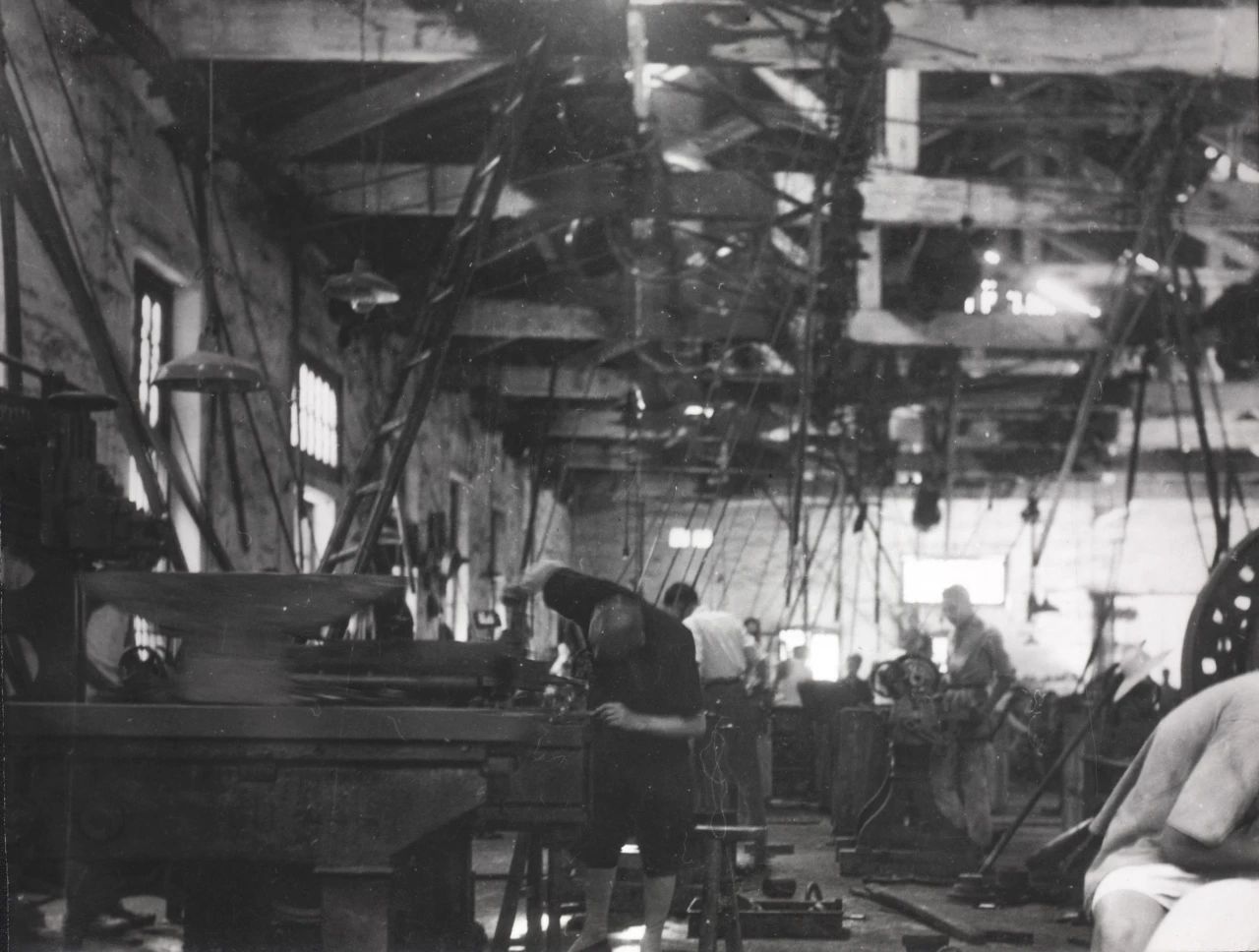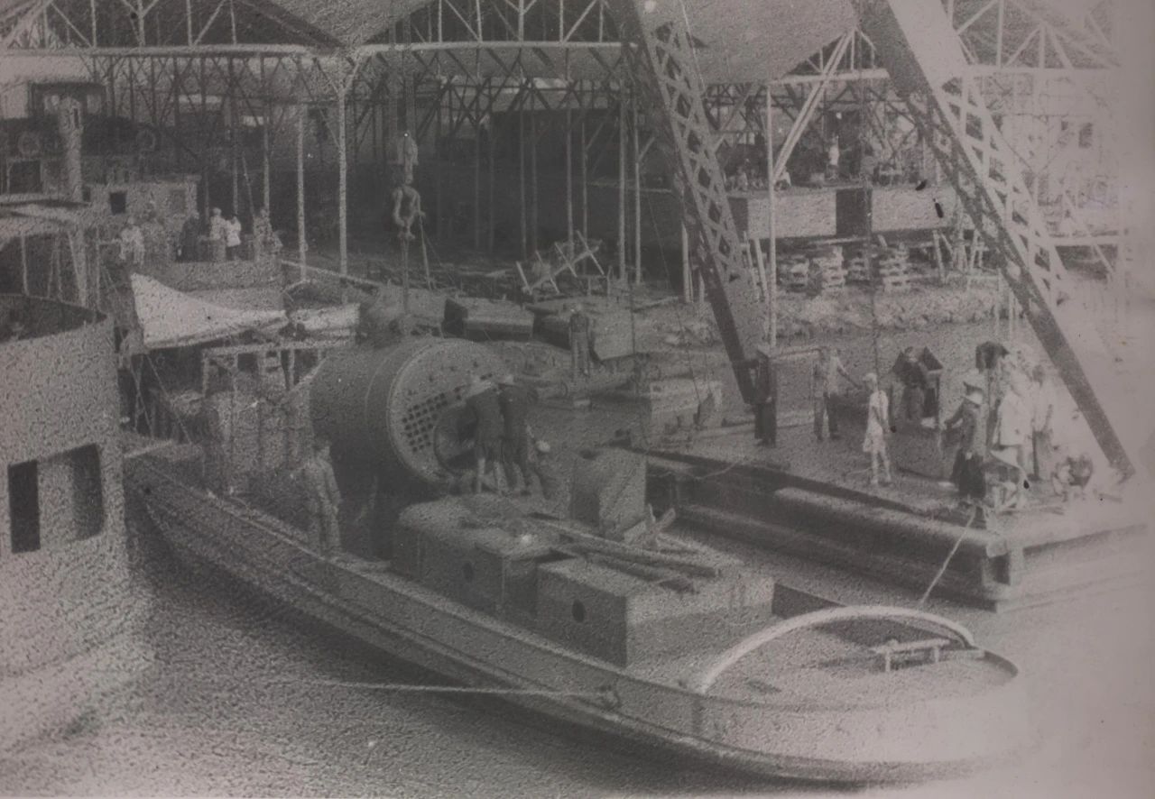 1934年武漢,上世紀(jì)30年代,武昌造船成立之初,工人們以手工作業(yè)“敲敲打打”形式開展修造船業(yè)務(wù)。修造的船只大多為100~300噸、鋼肋骨與木殼結(jié)構(gòu),僅有少量是鋼鉚接船體。建造的船只只能在長江上航行跑跑運輸。為了生存和救國,船廠還建造一些農(nóng)用機械器具、槍支,以輔助民生、支援抗日。