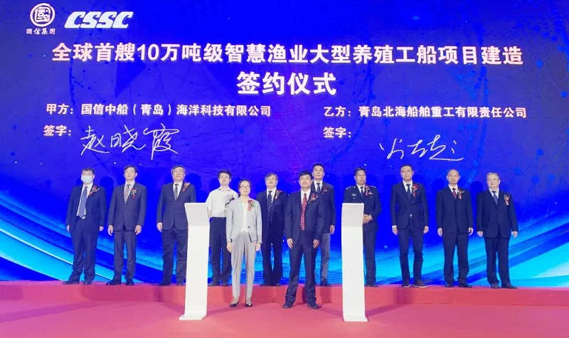 ????6月3日,中國(guó)船舶集團(tuán)有限公司旗下武船集團(tuán)青島北海船舶重工有限責(zé)任公司與國(guó)信中船(青島)海洋科技有限公司在青島西海新區(qū)正式簽署全球首艘10萬(wàn)噸級(jí)智慧漁業(yè)大型養(yǎng)殖工船的建造合同。本次簽約標(biāo)志著養(yǎng)殖工船項(xiàng)目正式進(jìn)入實(shí)質(zhì)性建造階段,該船將于2022年3月交付。中國(guó)船舶集團(tuán)黨組成員、副總經(jīng)理孫偉,青島市副市長(zhǎng)耿濤等領(lǐng)導(dǎo)和嘉賓出席簽約儀式。