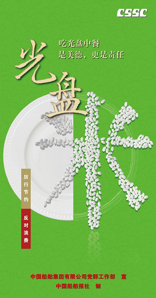 為認(rèn)真貫徹落實(shí)習(xí)近平總書(shū)記關(guān)于制止餐飲浪費(fèi)行為的重要指示精神,大力弘揚(yáng)中華民族勤儉節(jié)約、珍惜糧食的文明用餐習(xí)慣,中國(guó)船舶集團(tuán)積極開(kāi)展“制止餐飲浪費(fèi) 踐行光盤(pán)行動(dòng)”專項(xiàng)宣傳引導(dǎo)活動(dòng)。