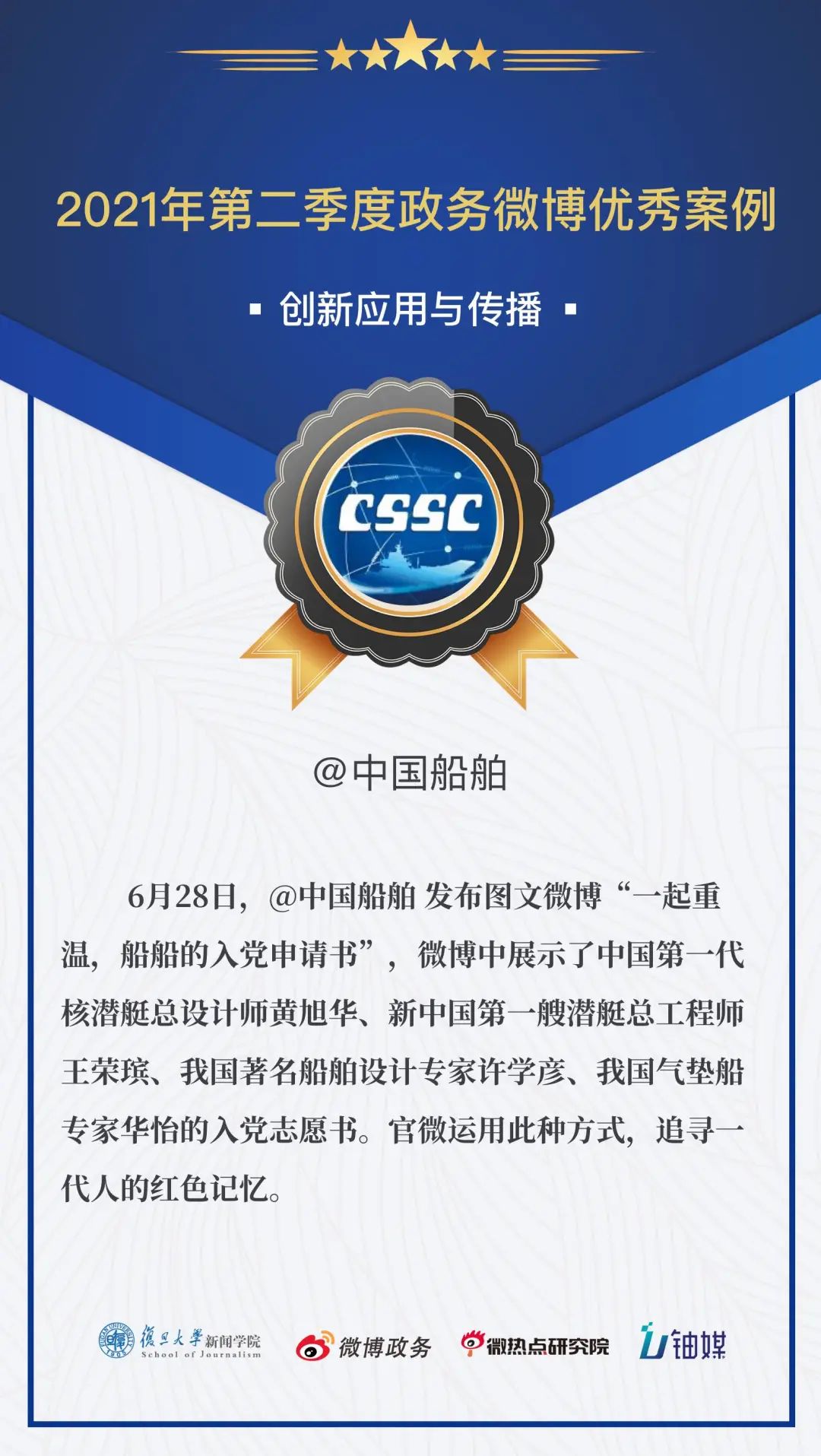 在幾百個(gè)微博政務(wù)賬號(hào)、幾千個(gè)微博政務(wù)優(yōu)秀案例的評(píng)選中,@中國船舶 憑借圖文微博“一起重溫,船船的入黨申請(qǐng)書”,再一次拿下“創(chuàng)新應(yīng)用與傳播”的獎(jiǎng)勵(lì),真的是太棒了!