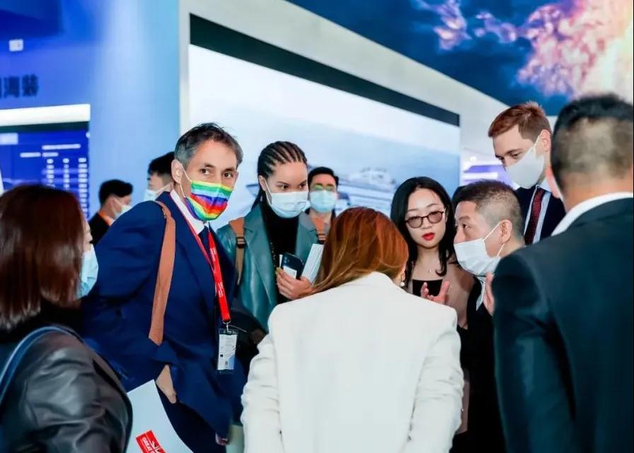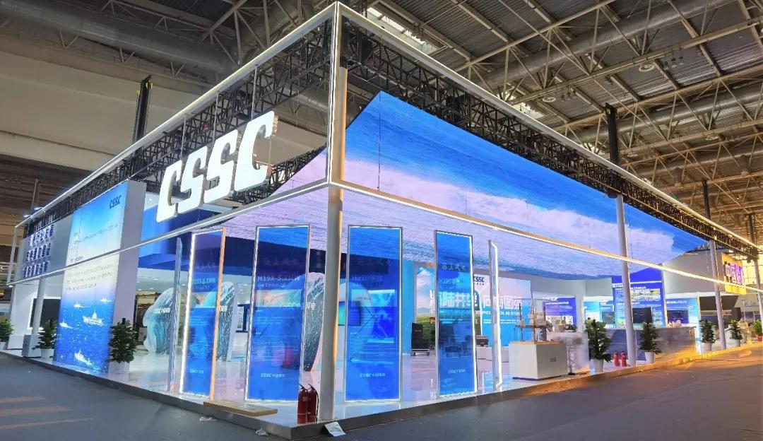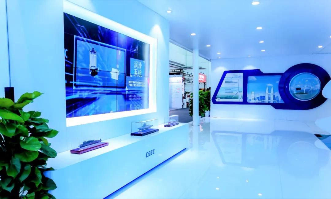 中國船舶集團展臺摒棄了“傳統(tǒng)色彩矩陣”,用“深海藍”加 “風機白”打造出大氣磅礴的開合式復(fù)合空間域,細節(jié)上則采用生態(tài)為先、大道至簡、科技為尚三大設(shè)計語言,將“風傳送”“海推動”“碳排放”業(yè)務(wù)生態(tài)鏈條進行了全方位的解構(gòu),吸引了眾多觀展人士駐足。