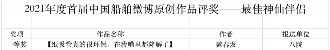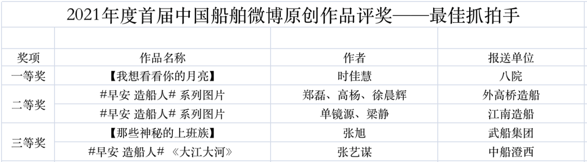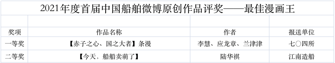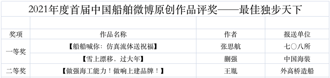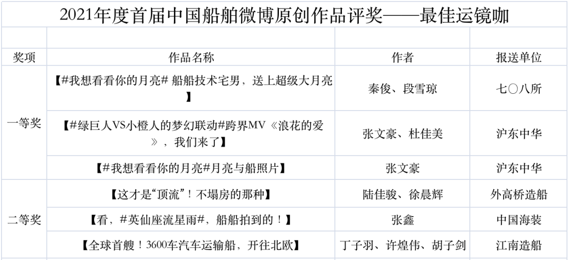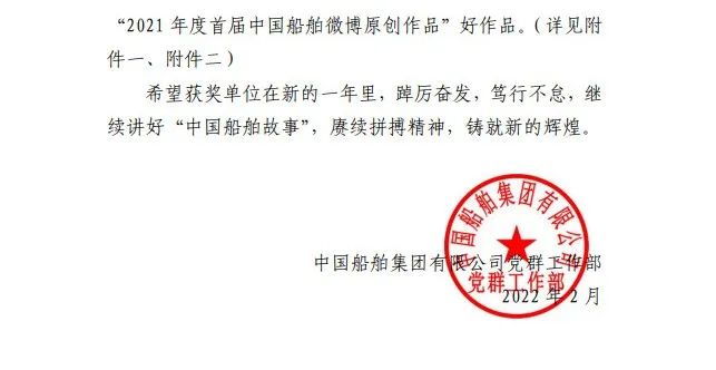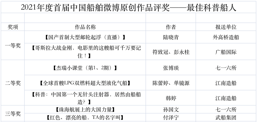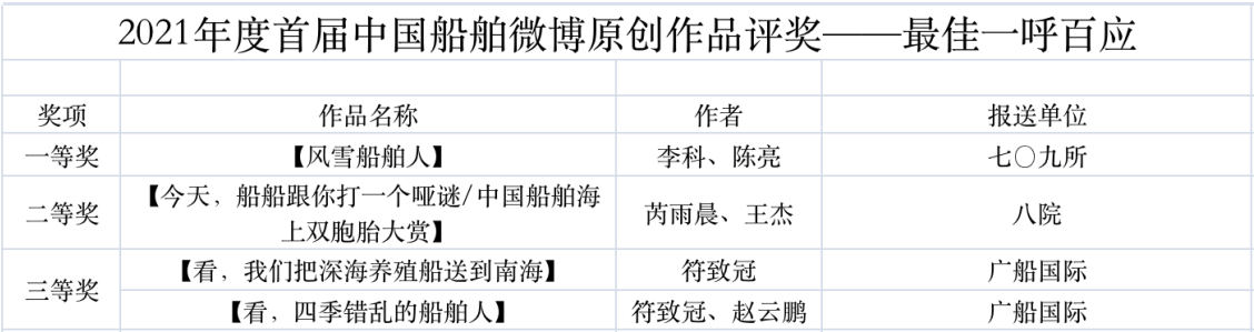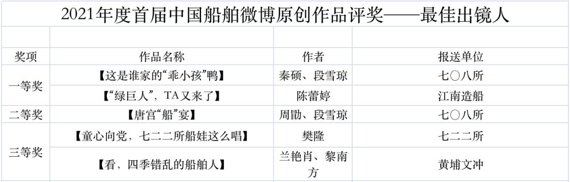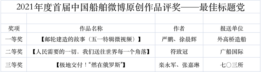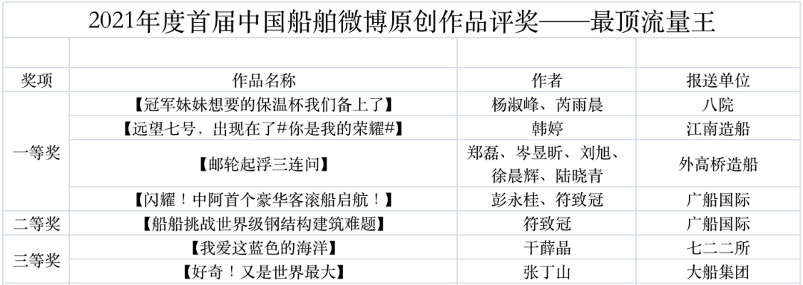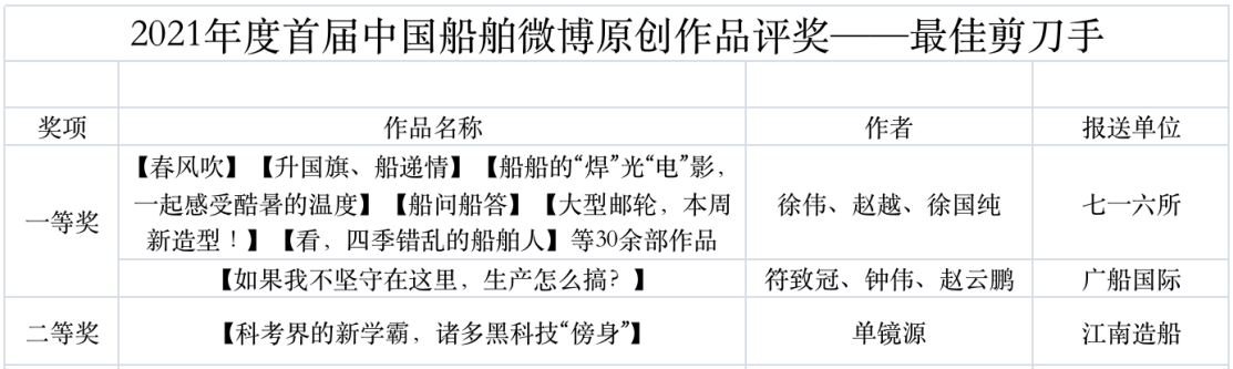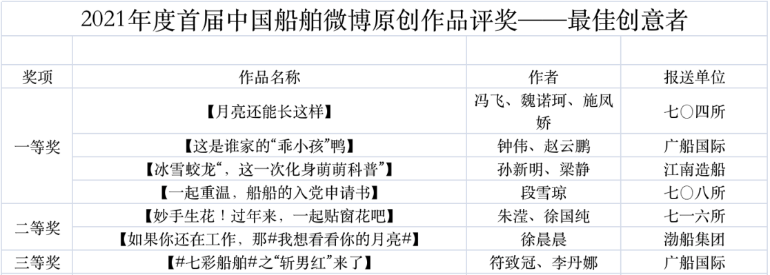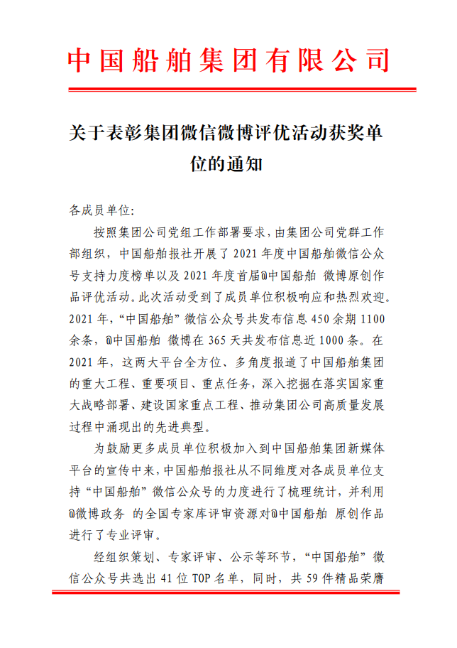 為鼓勵(lì)更多成員單位積極加入到中國(guó)船舶集團(tuán)新媒體平臺(tái)的宣傳中來,在集團(tuán)公司黨群工作部的指導(dǎo)下,中國(guó)船舶報(bào)社從不同維度,對(duì)2021年度各單位支持“中國(guó)船舶”微信的力度進(jìn)行了梳理統(tǒng)計(jì),并利用微博政務(wù)的全國(guó)專家?guī)煸u(píng)審資源,對(duì)2021年度“中國(guó)船舶”微博原創(chuàng)作品進(jìn)行了專業(yè)評(píng)審,評(píng)選結(jié)果公布如下: