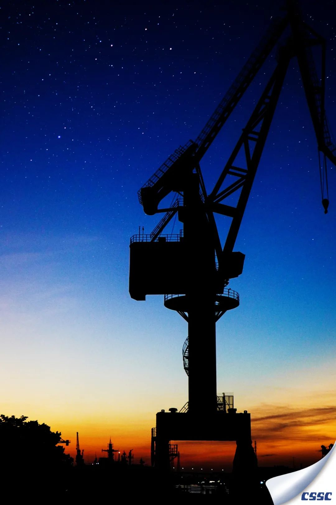 雖與巨輪不同,但船舶生產(chǎn)場地的起重器械亦可稱大國重器。此圖拍攝于2022年2月11日黃埔文沖,恰逢黃昏與星夜交替,器械與船舶共舞。舉起相機對著夕陽,記錄下這美好的時刻,以剪影的形式表現(xiàn)工作中的船舶風景。