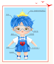 設計說明:圍繞“愛在深藍”志愿服務為主題設計了一名小男孩IP形象,深藍色的發(fā)色呼應主題。紅色的帽子和三角巾突出志愿服務的形象與船舶青年熱血有愛志愿精神。雪白的T恤在胸口印有“愛在深藍”品牌LOGO,彰顯小男孩的身份與純潔進步的“艦船報國、向海圖強”的船舶青年志向??蓯矍疑珘K明顯的IP形象設計,通過紅藍撞色使IP形象更具有吸引力。小男孩形象設計簡潔,方便進行后期表情包、日歷、書簽等2D周邊設計,與3D實物生產(chǎn)。
