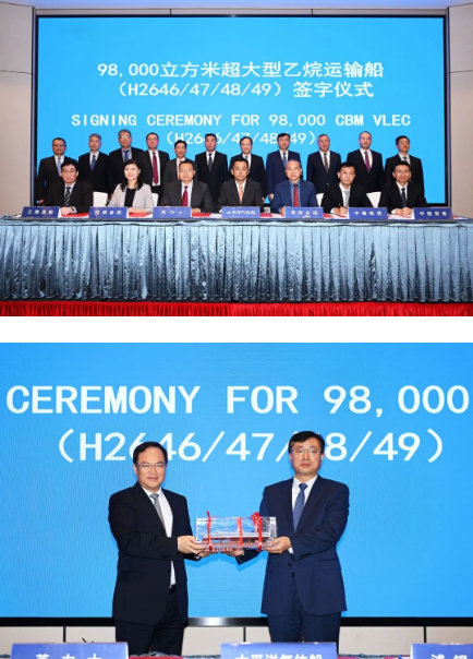 11月2日,中國船舶集團旗下江南造船(集團)有限責(zé)任公司承建的,山東海洋集團下屬太平洋氣體船4艘超大型乙烷運輸船項目簽約儀式在上海舉行。中國船舶集團黨組副書記、總經(jīng)理楊金成,黨組成員、副總經(jīng)理孫偉,山東海洋集團黨委書記、董事長姜國棟,黨委委員、副總經(jīng)理于冰出席儀式。