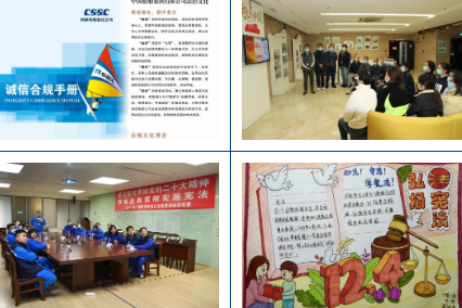 風(fēng)帆公司、綜合院等單位發(fā)布合規(guī)手冊,組織簽署合規(guī)承諾和合規(guī)考試;中船澄西、投資公司、七一一所、七二六所等單位精心制作并設(shè)置憲法宣傳展板;江南造船、中船九院等單位開展憲法法律知識(shí)問答,實(shí)現(xiàn)以考促學(xué);廣州公司持續(xù)開展“送法進(jìn)校園”憲法宣傳活動(dòng),將法治學(xué)習(xí)延伸到所屬技校、幼兒園;七一〇所、七一五所等單位開展法律咨詢志愿服務(wù)活動(dòng),對外樹立良好的“法治形象”;駐香港企業(yè)中船資本、中船租賃大力宣傳憲法及香港基本法、香港國安法,提升員工憲法法治意識(shí)。