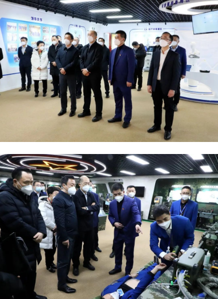 譚作鈞一行參觀了中國(guó)船舶集團(tuán)旗下中船海神醫(yī)療科技有限公司應(yīng)急醫(yī)療救援裝備展廳,觀摩了公司自主研制的便攜式通用生命支持系統(tǒng)模擬急救現(xiàn)場(chǎng)演示,詳細(xì)了解了有關(guān)產(chǎn)品的技術(shù)研發(fā)、性能指標(biāo)、應(yīng)用場(chǎng)景和生產(chǎn)保供能力等情況。
