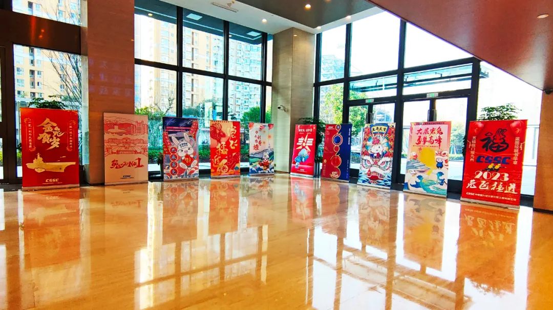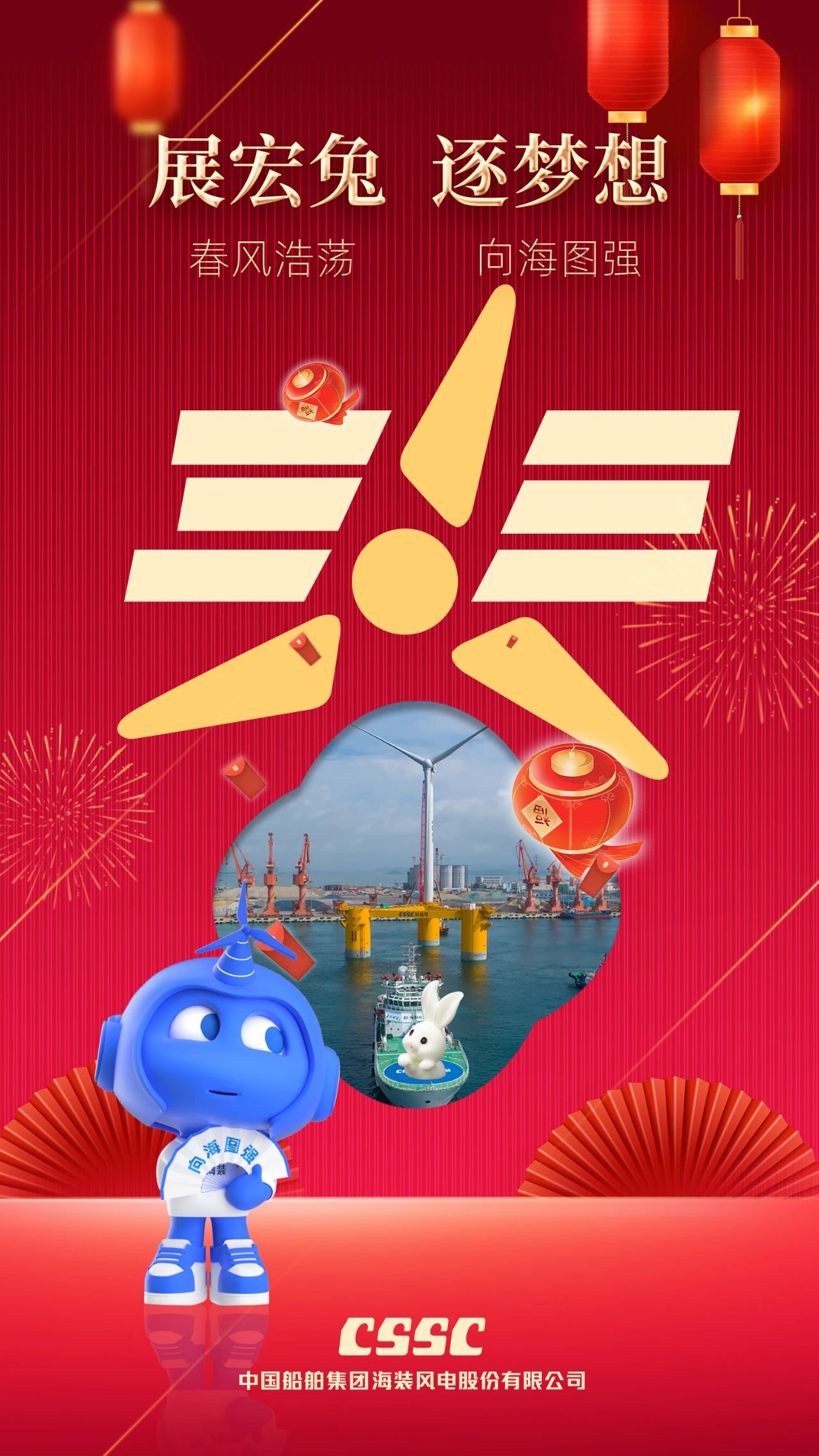 海報主體部分以國內首臺深遠海浮式風電裝備“扶搖號”為創(chuàng)意點,通過含有“大風車”形象的寫意“春”字,表達中船海裝將在春風浩蕩中大展宏“兔”,在向海圖強征程中矢志奮斗!
