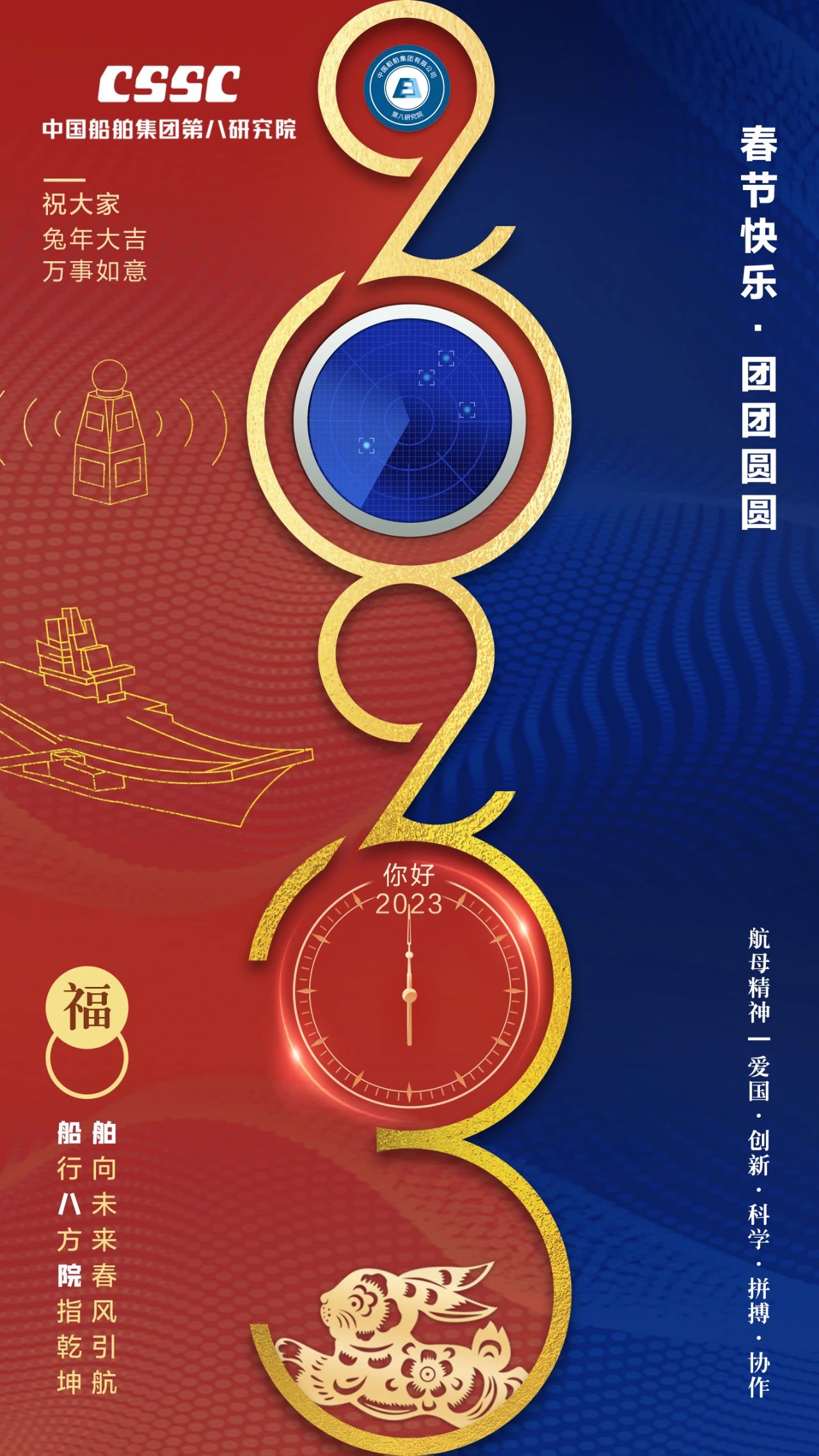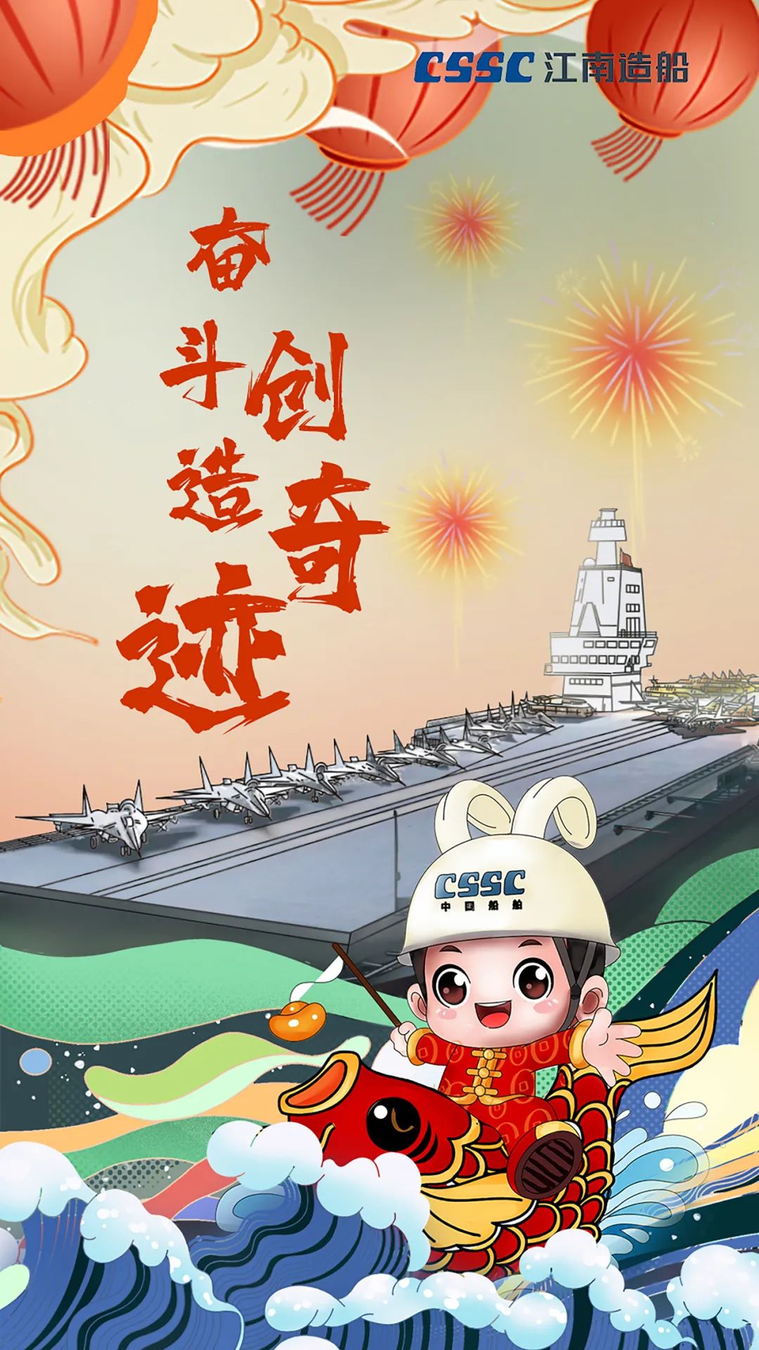 海報中所展現(xiàn)的元素,皆由大連造船元素組成,中間癸卯兔的頭冠裝飾以船錨、舵軸為主,下方航母在海中追風逐浪,象征大連造船必將在新時代發(fā)展中踏浪前行。