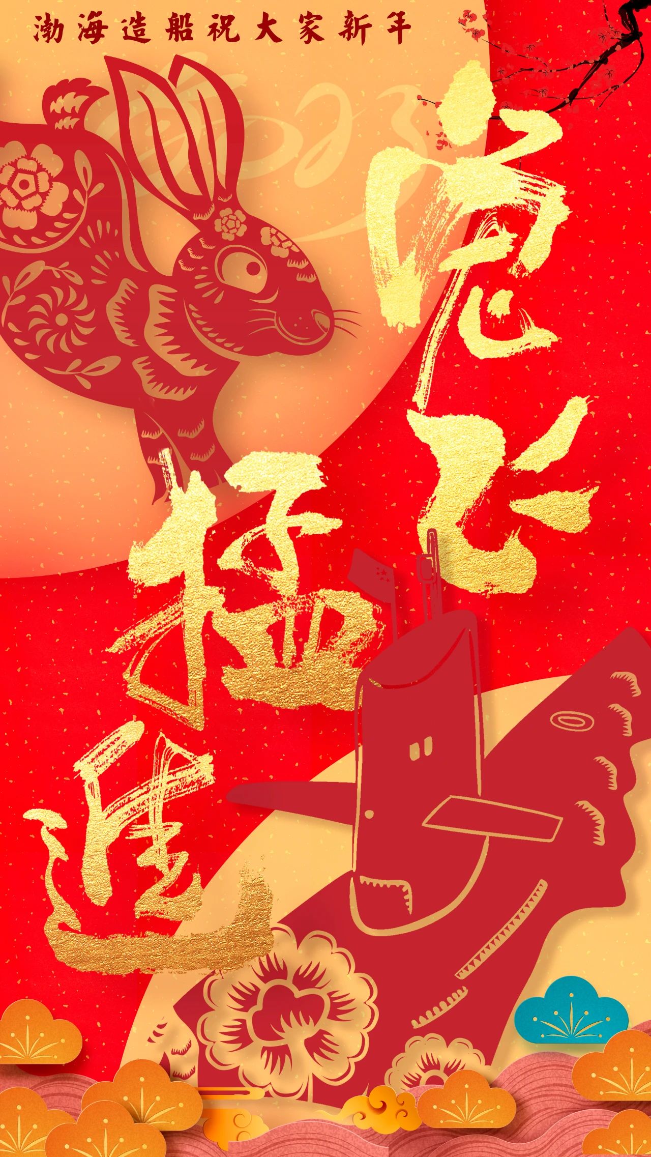 渤海造船的拜年海報以紅色背景為基礎,奠定喜慶祥和的節(jié)日氛圍,畫面主體采用中國傳統(tǒng)民間剪紙藝術,將飛騰的瑞兔與破浪的國之重器有機結合,讓我們2023年突飛猛進,大展宏圖!