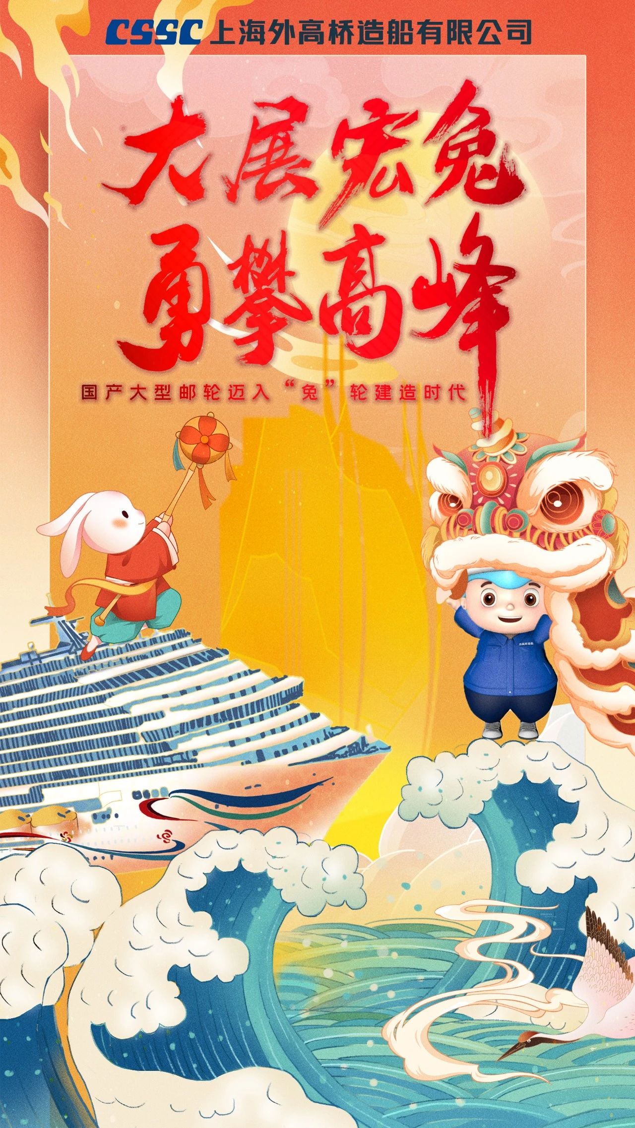 它采用插畫表現(xiàn)形式,勾勒出在煙花綻放的夜空下,滬東中華的龍門吊和LNG船等。玉兔逢春開新局,2023,我們將繼續(xù)拼搏,展宏“兔”!