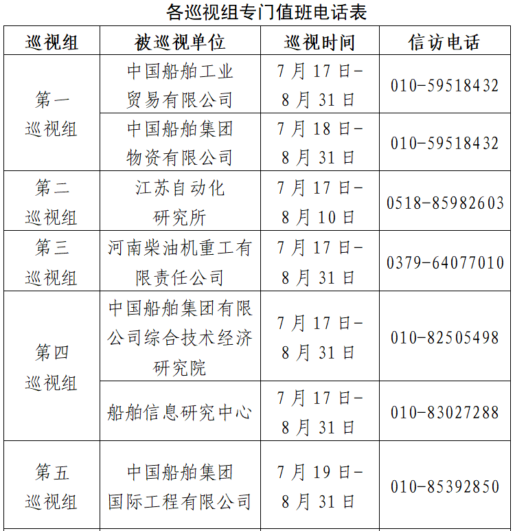 根據(jù)中國船舶集團(tuán)黨組2023年第一輪巡視工作部署,截至2023年7月17日,巡視工作已經(jīng)鋪開。其中,對(duì)中國船舶工業(yè)貿(mào)易有限公司、中國船舶集團(tuán)物資有限公司、江蘇自動(dòng)化研究所、河南柴油機(jī)重工有限責(zé)任公司、中國船舶集團(tuán)有限公司綜合技術(shù)經(jīng)濟(jì)研究院、船舶信息研究中心、中國船舶集團(tuán)國際工程有限公司等7家單位開展常規(guī)巡視,對(duì)中船上海船舶工業(yè)有限公司、廣州船舶工業(yè)有限公司等2家單位開展專項(xiàng)巡視,對(duì)武漢數(shù)字工程研究所、武漢船用電力推進(jìn)裝置研究所、武漢重工鑄鍛有限責(zé)任公司、中國船舶集團(tuán)長江科技有限公司、中船重工衡遠(yuǎn)科技有限公司等5家單位開展巡視“回頭看”。