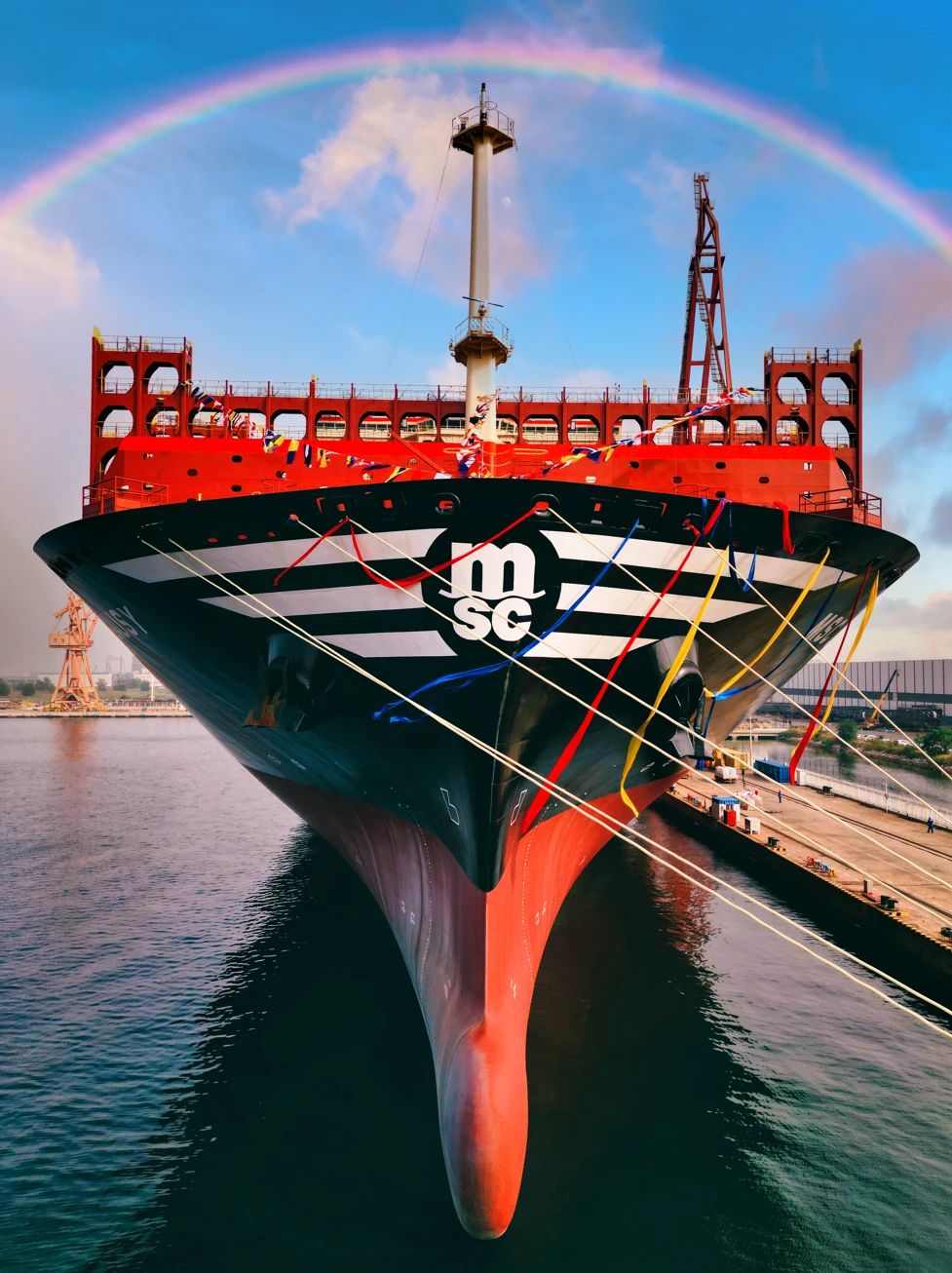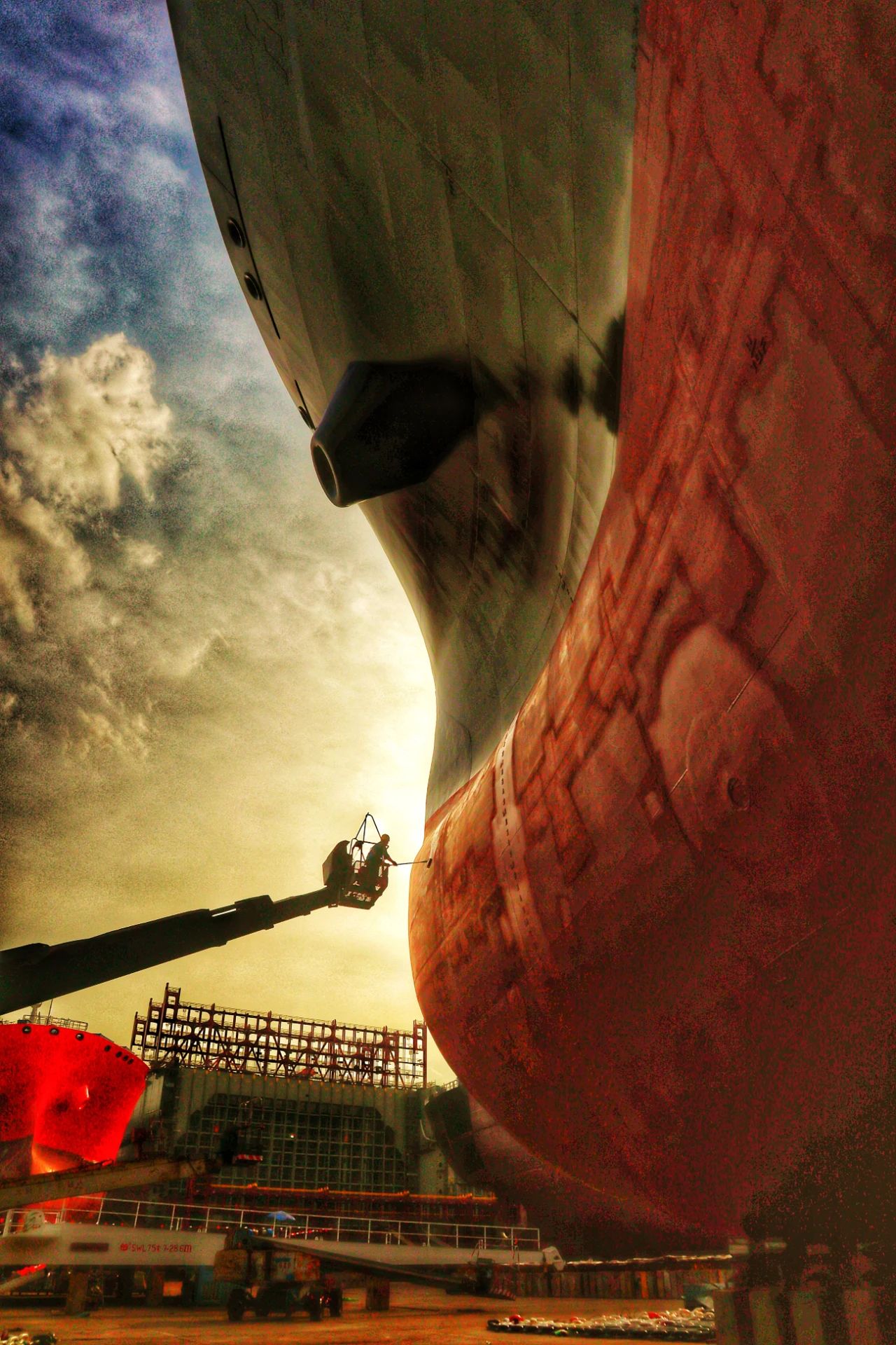 壯麗的船身如山巒一般,余暉映襯下,一位工人正駕駛高空車(chē)完成外板清潔施工,構(gòu)成一幅絕美的畫(huà)面。