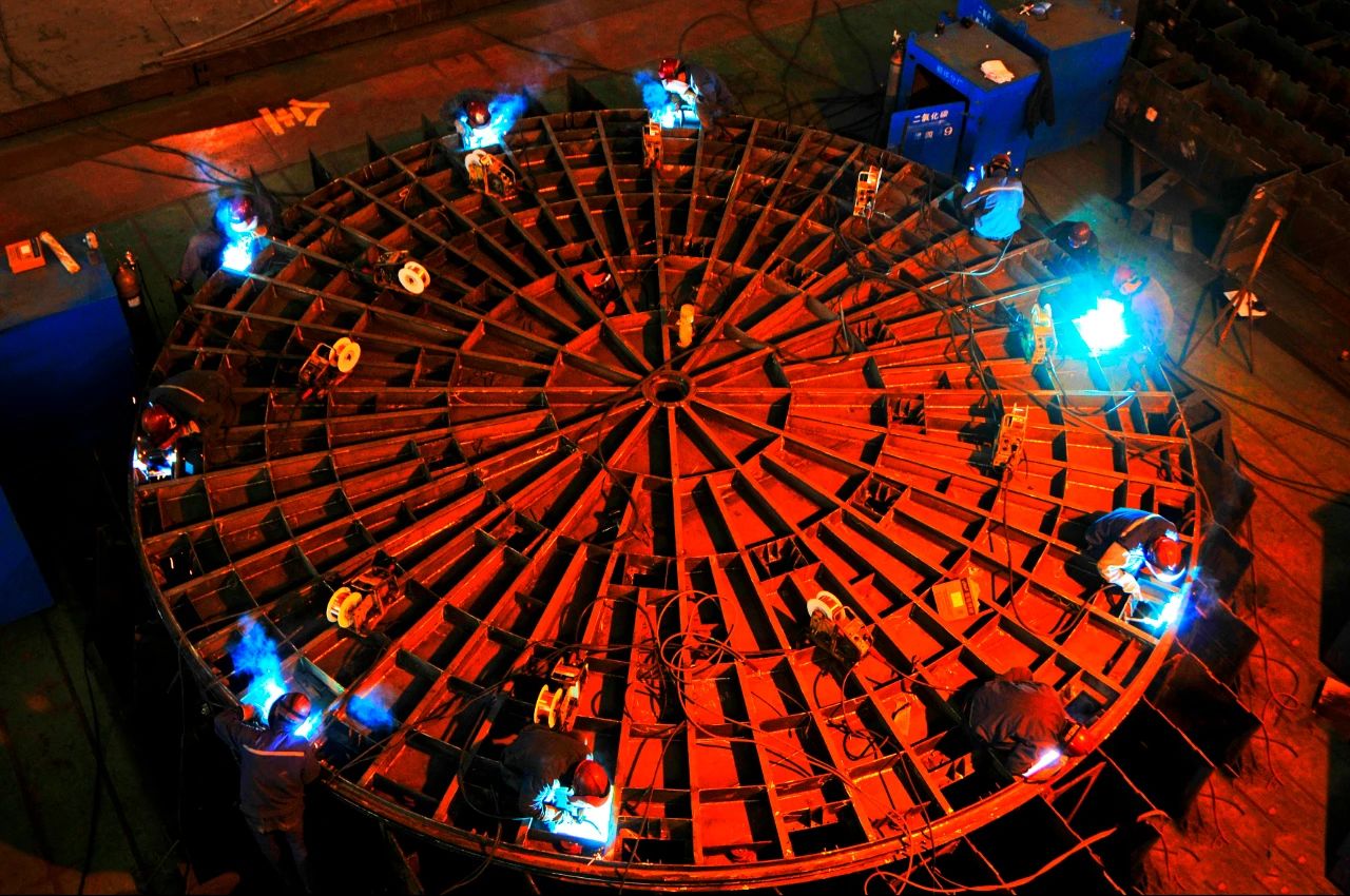 該作品反映的是造船工人在車(chē)間里焊接分段的場(chǎng)面。為了保證焊接件不受熱脹冷縮的影響而變形,需要十幾個(gè)工人從不同角度同時(shí)不間斷焊接,有時(shí)連續(xù)工作十幾個(gè)小時(shí),直至焊接件全部完成。在這不是戰(zhàn)場(chǎng)勝似戰(zhàn)場(chǎng)的車(chē)間里,每一名工人都在聚精會(huì)神地激戰(zhàn)著。