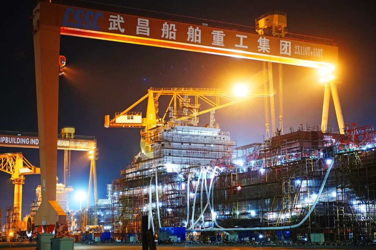 在武漢船機(jī)平臺(tái)總裝現(xiàn)場(chǎng),華夏金租神大平臺(tái)配套的1200噸起重機(jī)正在安裝,大件吊裝各項(xiàng)準(zhǔn)備工作繁瑣,一切就緒時(shí),天已經(jīng)黑了,現(xiàn)場(chǎng)一鼓作氣開(kāi)始吊裝對(duì)接,展現(xiàn)了船舶人只爭(zhēng)朝夕、不負(fù)韶華、忘我工作精神風(fēng)貌。