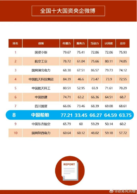 1月31日,由微博出品,人民網(wǎng)輿情數(shù)據(jù)中心、人民網(wǎng)數(shù)據(jù)研究院提供學術(shù)支持的“2023年度政務微博影響力報告”發(fā)布?!爸袊啊蔽⒉┑巧稀叭珖髧Y央企微博”榜單,這是“中國船舶”微博第三次進入“全國十大國資央企微博”排行榜。