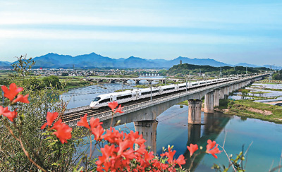 4月14日,一列動車穿行“中國最美高鐵”合福線新安江休寧古城巖大橋。徐 明攝(人民視覺)