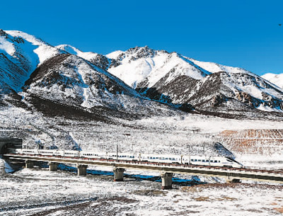 2月26日,位于甘肅、青海兩省交界處的祁連山白雪皚皚,一列動車駛出被譽為世界海拔第一高鐵隧道的祁連山隧道。 成 林攝(人民視覺)