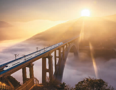 2016年12月28日,一列動車組正在穿越云霧繚繞的南盤江特大橋。本報記者 史家民攝