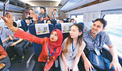6月17日,100余名留學生從西安出發(fā),乘坐寶蘭高鐵試運行動車組前往蘭州,初次體驗即將開通運營的首條貫通新絲路高鐵。圖為幾名外國留學生在動車組試驗列車上自拍。唐振江攝(人民視覺)