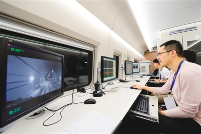 6月20日,西(安)成(都)高鐵陜西段聯(lián)調聯(lián)試正式啟動。圖為當高速綜合檢測列車穿越秦嶺時,技術人員在監(jiān)測列車運行數(shù)據(jù)。新華社記者 李一博攝