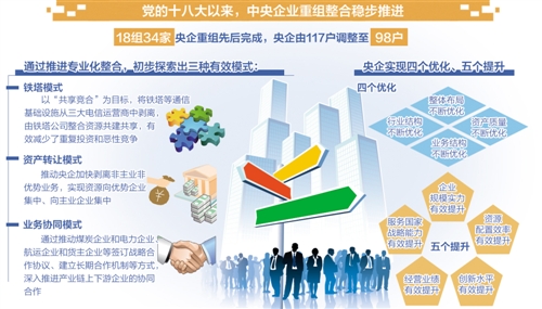 黨的十八大以來,中央企業(yè)的重組整合,成為國(guó)企改革的重要內(nèi)容。5年來,中央企業(yè)的重組整合穩(wěn)步推進(jìn),國(guó)務(wù)院國(guó)資委先后完成18組34家央企重組,央企由117戶調(diào)整至98戶。