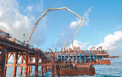 7月6日,隨著主橋23號(hào)墩承臺(tái)最后一車(chē)混凝土的澆筑,中國(guó)援馬爾代夫中馬友誼大橋5個(gè)主橋承臺(tái)全部施工完成,標(biāo)志著占全橋施工總量約70%的主橋部分從此徹底擺脫印度洋的強(qiáng)涌浪襲擾,進(jìn)入上部結(jié)構(gòu)施工階段。
