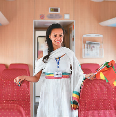 2016年10月5日,在埃塞俄比亞首都亞的斯亞貝巴,一名當(dāng)?shù)厝嗽嚦藖喖F路通車(chē)當(dāng)日的第一列旅客列車(chē)。新華社記者 孫瑞博攝