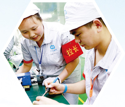 華鎣市一家企業(yè)的生產(chǎn)線負責人唐定燕(左),向徒弟講解生產(chǎn)技術(shù)。周松林攝