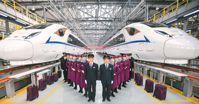 12月4日,西成高鐵首發(fā)乘務(wù)班組在中國(guó)鐵路成都局集團(tuán)有限公司成都動(dòng)車段亮相。(薛玉斌 攝)
