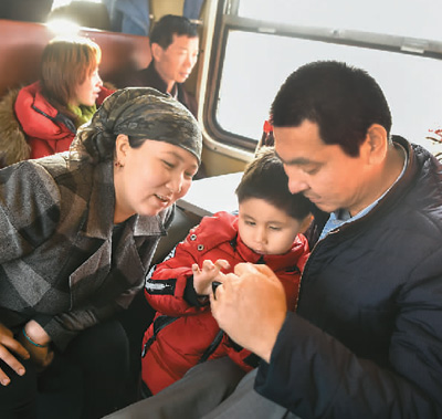 11月25日,在新疆塔克拉瑪干沙漠西南緣的喀什-和田對(duì)開(kāi)火車“和田玉龍?zhí)枴鄙?,旅客們正在休息。(趙 戈 攝)