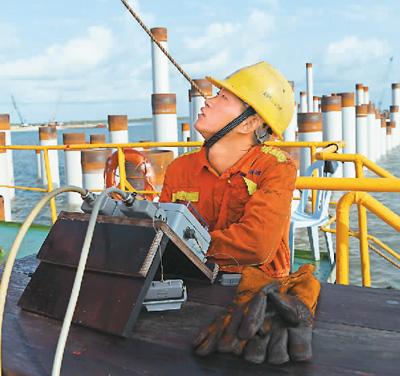 7月30日,在肯尼亞拉穆港,工作人員在中國(guó)交建“粵工樁11號(hào)”施工船上工作。(陳 誠(chéng) 攝)