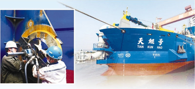“船上鋼樁臺車安裝了4個大油缸,單個就達38噸,所有安裝誤差都只有0.2毫米”,安裝輪機車間主任沙勝紅說,“考驗還在繼續(xù)”。輪機車間的工人全部是訓(xùn)練有素的技術(shù)員工,他們克服了難以想象的困難,硬是拿下全船高難度的設(shè)備安裝工作,質(zhì)量贏得船東、船檢的一致好評。
