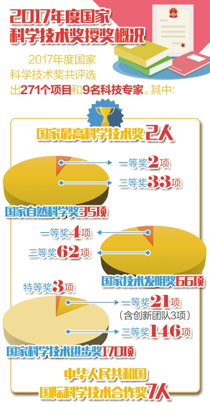 1月8日,2017年度國家科學(xué)技術(shù)獎(jiǎng)勵(lì)大會(huì)在北京人民大會(huì)堂隆重舉行。2名科學(xué)家獲得國家最高科學(xué)技術(shù)獎(jiǎng),271個(gè)項(xiàng)目獲得國家自然科學(xué)獎(jiǎng)、國家技術(shù)發(fā)明獎(jiǎng)、國家科學(xué)技術(shù)進(jìn)步獎(jiǎng)三大獎(jiǎng),7名外籍專家獲得國際合作獎(jiǎng)。