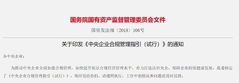 11月2日,國務院國資委印發(fā)了《中央企業(yè)合規(guī)管理指引(試行)》,推動中央企業(yè)全面加強合規(guī)管理,加快提升依法合規(guī)經營管理水平,著力打造法治央企,保障企業(yè)持續(xù)健康發(fā)展。