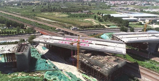 ????該工程上跨鄭焦城際、京廣鐵路等3條線5股道,每天有140對高鐵列車和貨運列車擦肩而過,轉體橋與鐵路線的最近距離只有8.7米,加上該工程橋梁全長317米,寬38.7米,轉體懸臂長71.75米,單側轉體橋梁重達3萬噸,鐵路東、西兩側轉體橋梁總重達6萬噸,體量大,風險高,施工難度可想而知。為確保總重量達6萬噸的轉體橋精準對接,重點在于球鉸的制作、安裝,轉體過程中應力應變、位移與線性的實時監(jiān)測。本次成功應用的轉動體系采用鋼球鉸,由雙瑞特裝設計、制造、安裝及轉體施工,解決了大噸位橋梁轉體裝置超大承載力,靈活轉動的難題。