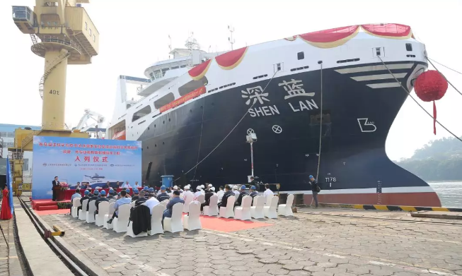 ????11月24日,青島海洋科學(xué)與技術(shù)試點(diǎn)國家海洋實(shí)驗(yàn)室(以下簡(jiǎn)稱“海洋試點(diǎn)國家實(shí)驗(yàn)室”)在黃埔文沖船舶有限公司舉行了我國首艘漁業(yè)捕撈加工一體船“深藍(lán)號(hào)”入列國家海洋實(shí)驗(yàn)室遠(yuǎn)??茖W(xué)考察船隊(duì)儀式。