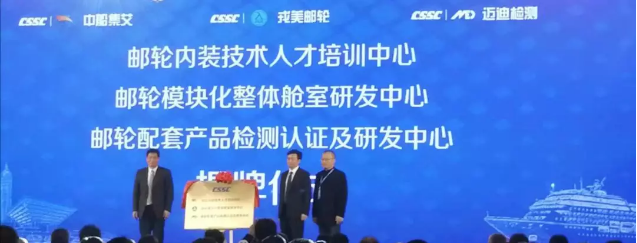 ????為解決我國郵輪配套產(chǎn)品認證難、艙室系統(tǒng)技術(shù)水平落后、專業(yè)人才匱乏等問題,在中船郵輪和中國船舶集團所屬中船九江海洋裝備(集團)有限公司的指導下,中國船舶集團所屬中船集艾郵輪科技發(fā)展(上海)有限公司聯(lián)合中國船級社和上海工程技術(shù)大學成立了《郵輪配套產(chǎn)品測試認證及研發(fā)中心》、《郵輪模塊化整體艙室研發(fā)中心》和《郵輪內(nèi)裝技術(shù)人才培訓中心》,并在會上正式揭牌。