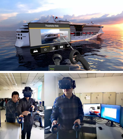 ????該平臺通過總體總師與三維造型師的協(xié)同交互,完成全船三維設(shè)計(全船造型和艙室內(nèi)部裝飾等)并搭建逼真場景,用戶通過穿戴智能頭顯,操縱控制手柄,真正實現(xiàn)了“漫步甲板、穿行船艙”的自主漫游體驗。