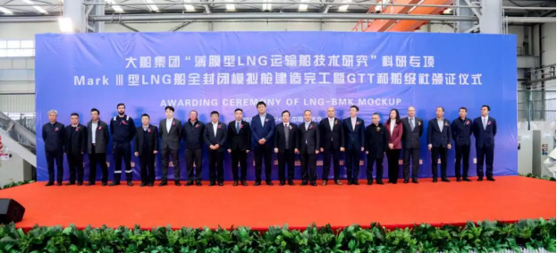 ????2019年11月26日,大船集團舉行“薄膜型LNG運輸船技術(shù)研究”科研專項MarkⅢ型LNG船全封閉模擬艙建造完工暨GTT和船級社頒證儀式。法國GTT公司、英國勞式船級社和中國船級社代表在模擬艙建造現(xiàn)場向大船集團代表頒發(fā)證書。