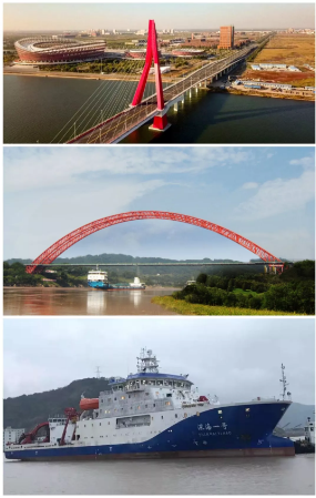 ????上圖所示均為武船集團(tuán)承建的項(xiàng)目。圖1:遼寧盤錦遼濱沿海經(jīng)濟(jì)開(kāi)發(fā)區(qū)大橋;圖2:四川合江長(zhǎng)江一橋;圖3:我國(guó)自主研制的第一艘載人潛水器支持母船“深海一號(hào)”。