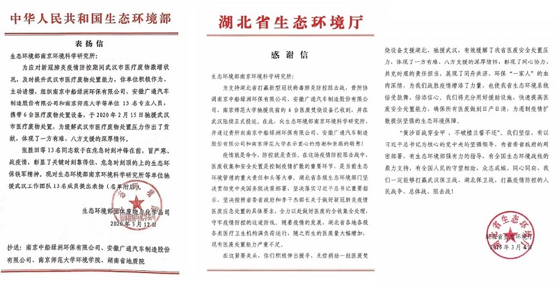 ????近日,國家生態(tài)環(huán)境部、湖北省生態(tài)環(huán)境廳分別發(fā)出表揚信和感謝信,對中國船舶集團所屬中船綠洲等在疫情防控期間作出貢獻的單位給予高度贊揚,表示衷心的感謝,并對包含中船綠洲旗下環(huán)保公司陳紀賽、陳良義、王小峰、周浩在內的13名生態(tài)環(huán)境“鐵軍”提出表揚。