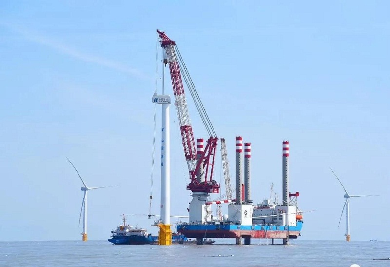 ????本次安裝難度大,30號(hào)風(fēng)機(jī)單葉片長(zhǎng)73.5米,旋轉(zhuǎn)直徑達(dá)158米,輪轂高度81米。塔筒共分為底、中、頂三段,風(fēng)機(jī)整體總重量790噸以上,相當(dāng)于500余輛小汽車的重量?!罢窠?hào)”平臺(tái)安裝3臺(tái)1800千瓦電力推進(jìn)全回轉(zhuǎn)舵槳,配備3臺(tái)750千瓦艏側(cè)推裝置。航速7節(jié),續(xù)航能力達(dá)3000海里,定員100人,平臺(tái)最大作業(yè)水深50米,甲板作業(yè)面積約2500平方米,可容納3套6兆瓦級(jí)風(fēng)機(jī)或2套8兆瓦級(jí)風(fēng)機(jī),并且可以獨(dú)立完成6兆瓦、8兆瓦級(jí)風(fēng)機(jī)的安裝和其他水上工程施工的起重、打樁、吊裝和運(yùn)輸?shù)茸鳂I(yè)。
