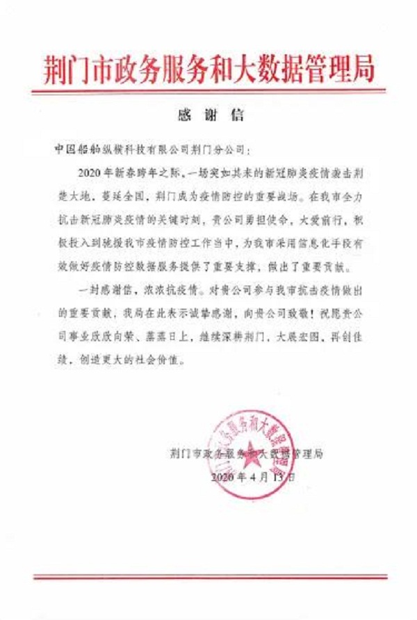 ????中國(guó)船舶集團(tuán)七一〇所縱橫公司荊門分公司收到荊門市政務(wù)服務(wù)和大數(shù)據(jù)管理局寄來(lái)的感謝信,感謝其在抗擊新冠肺炎疫情的關(guān)鍵時(shí)刻,為荊門市采用信息化手段有效做好疫情防控?cái)?shù)據(jù)服務(wù)提供了重要支撐,作出了重要貢獻(xiàn)。