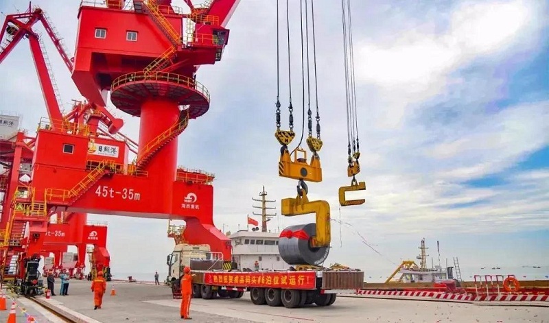 ????該門機主要用于成品鋼板、卷裝船及煤炭、廢鋼等裝卸船作業(yè)。門機配備有平衡掛梁、廢鋼吸盤、C字鉤、板杯夾鉗、散貨抓斗、六瓣廢鋼抓斗6種吊具,能滿足從鋼廠原材料海上進貨卸船,到成品(鋼卷、鋼板)裝船海運等整個過程的裝卸需求,改變了鋼廠以往只能依靠陸地貨運進行成品運輸?shù)臓顩r,極大地提高運輸效率。
